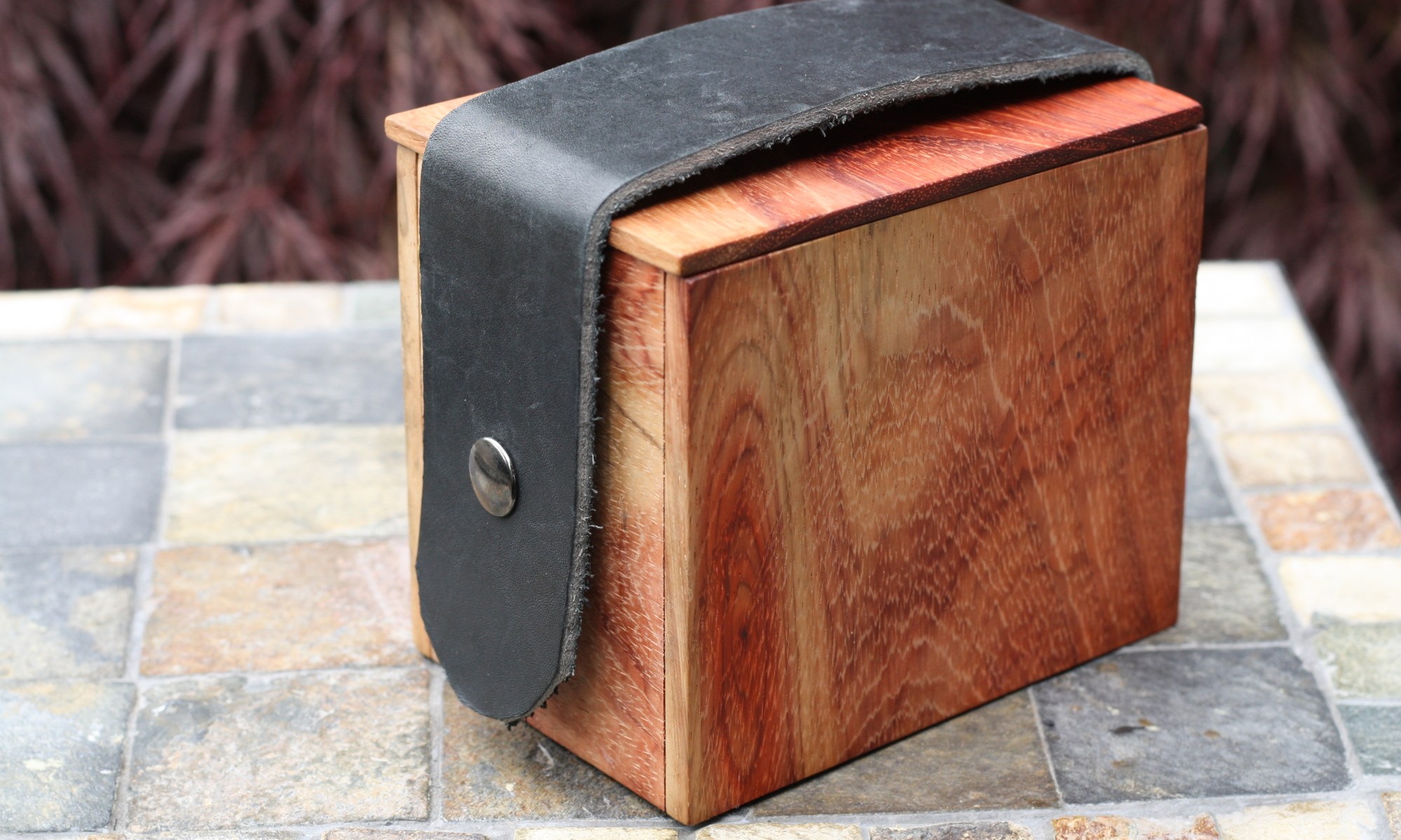 Elder Custom – $125.00 Black Italian leather lined; with 2″ thick black leather belting strap using antiqued nickel snaps. This box was has a great deal of sapwood which gives it a range of colors from black to red with white. Exquisite and unique, unlike all other Padauk samples we have run into. There is also a delightful hard sap crystal embedded in the lid side edge of the box giving it a certain mythical quality.