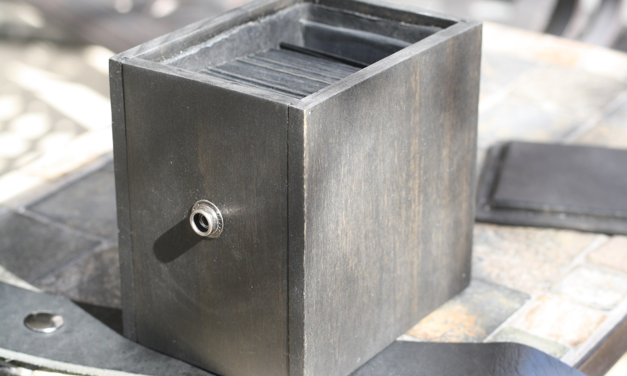 Elder Custom – $75.00 made from white Oak then Black Italian leather lined; with 1 1/2″ black leather belting strap utilizing antiqued nickel snaps. This box was not originally supposed to even become black but we had a dye mishap and the results were fairly fascinating. Since Oak did not respond to the stain at all like expected and it made one hell of a mess this is going to be a very limited item. Also it is very challenging to get good pictures of it; it does not have the red tint that is observed in the pictures it has a base grey/blond with dark black.