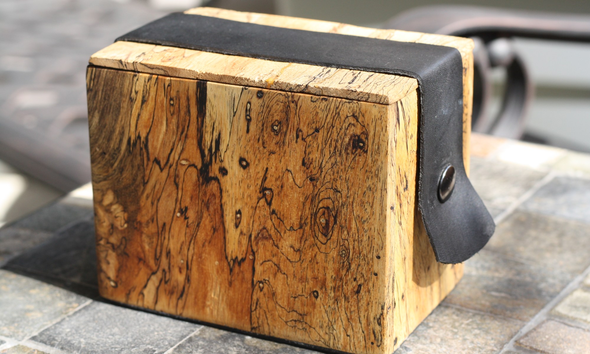 Tournament Custom – sold Black Italian leather lined with thin 1 1/2″ supple extra thin belting which is finished using antiqued nickel snaps. This particular box is one of our featured boxes and has beautiful exposed brown/purple heartwood at the bottom. The range of color on this box is unusually high even for Spalted, wandering from white/black into the deep yellow range then diving into the remarkable heartwood.